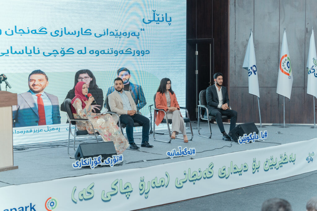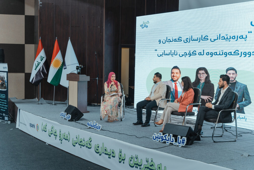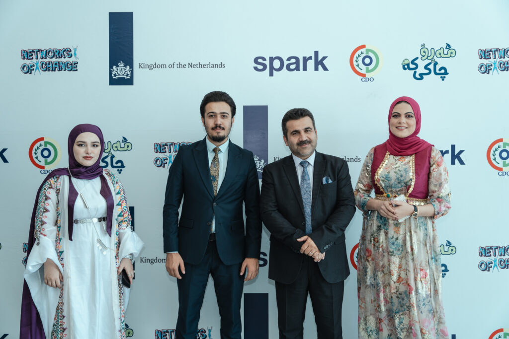 Last week, SPARK celebrated the closing ceremony of the first phase of the three-year program, Network of Change (NOC2), funded by the Netherlands Ministry of Foreign Affairs. The event took place at the Anfal Monument hall in Chamchamal town, Sulaymaniyah province, in partnership with our local partner, the Civil Development Organization (CDO). The Youth Forum brought together over 600 young people and numerous representatives from both the public and private sectors. The event featured speeches, panel discussions, musical performances, and an exhibition showcasing local businesses and young artisans, highlighting the NOC2 programme’s success in fostering community and empowering youth to become agents of positive change.