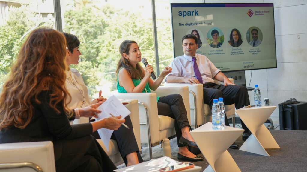 The panel featured notable participants, including Malakeh El Haj, Director of Knowledge & Innovation at Abdulla Al Ghurair Foundation; Sarah Shedeed, Head of Scholarships at Jusoor; Zeina Saab, Founder and Director of The Nawaya Network; and Imad El Hajj, Associate Dean at Maroun Semaan Faculty of Engineering & Architecture. These experts brought their insights and experiences to discuss the various initiatives, business models, and strategies that are working or not working in upskilling locals and matching them with digital jobs.